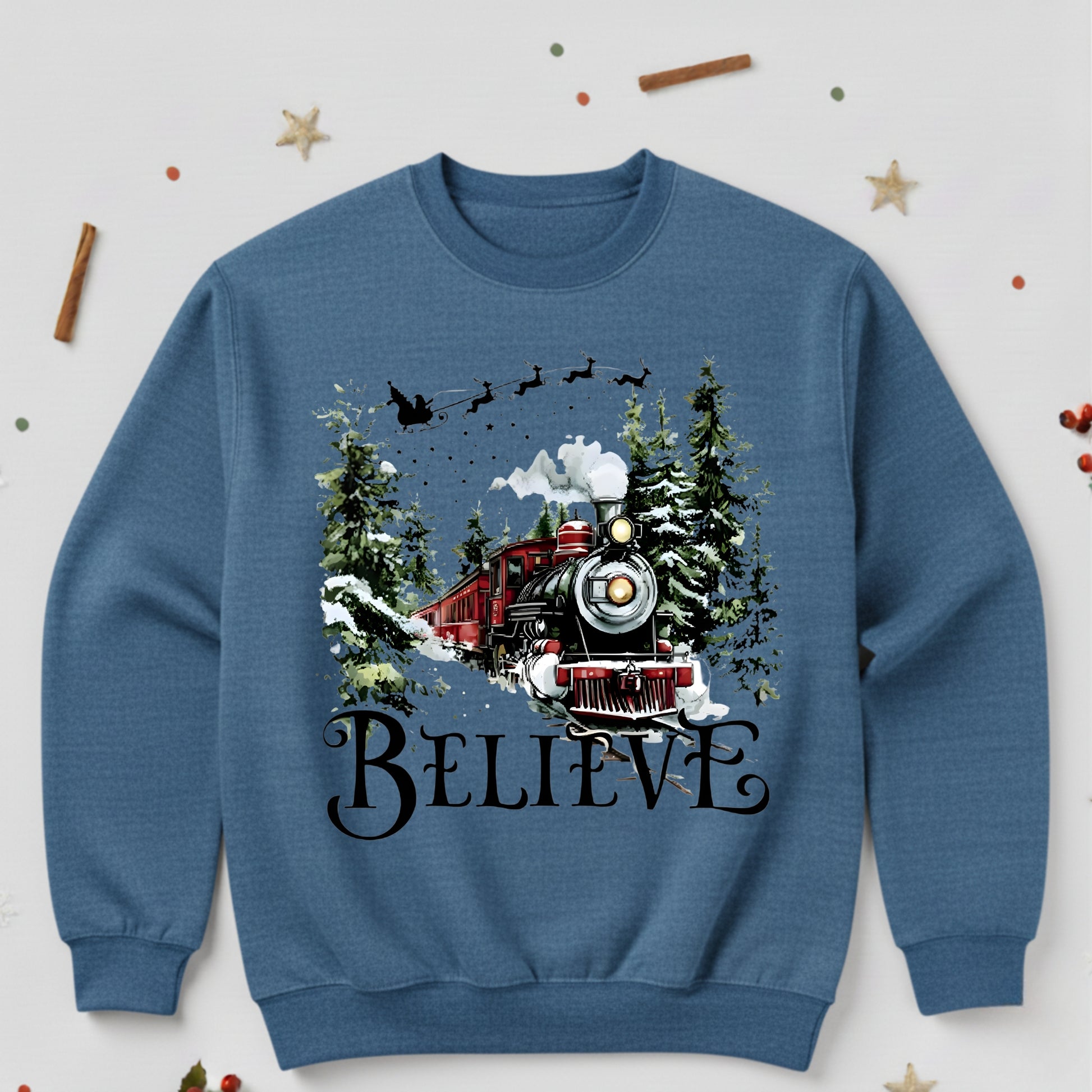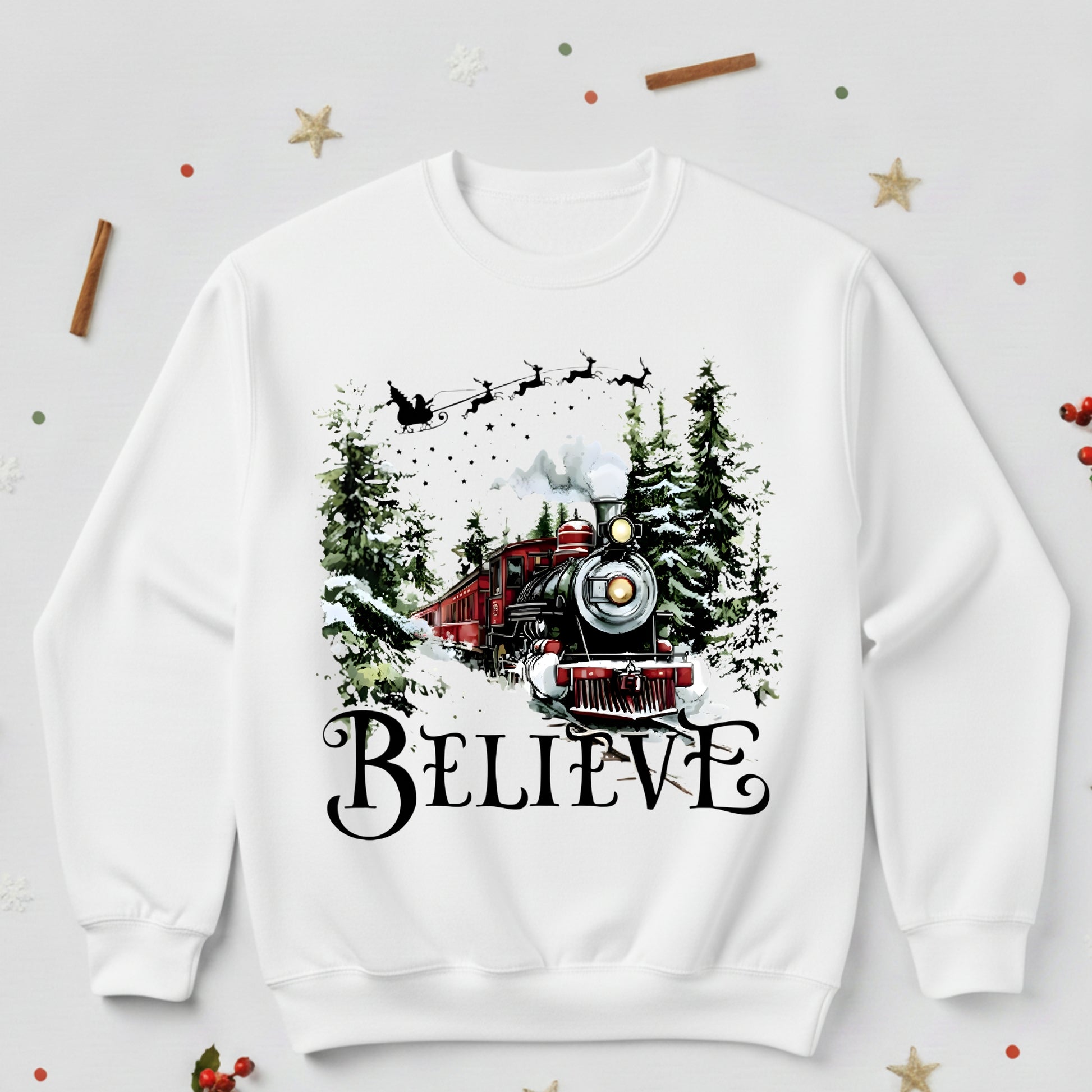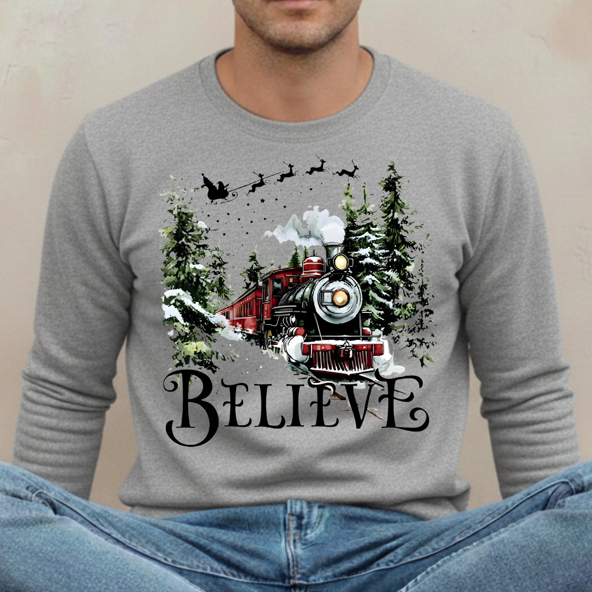 Believe Christmas Train Sweatshirt - Vintage Santa Sleigh Holiday Crewneck Pullover