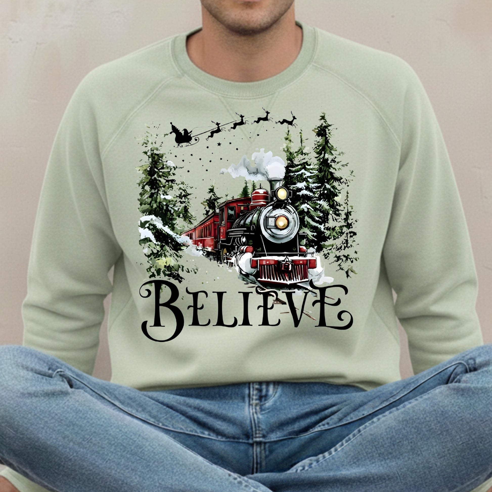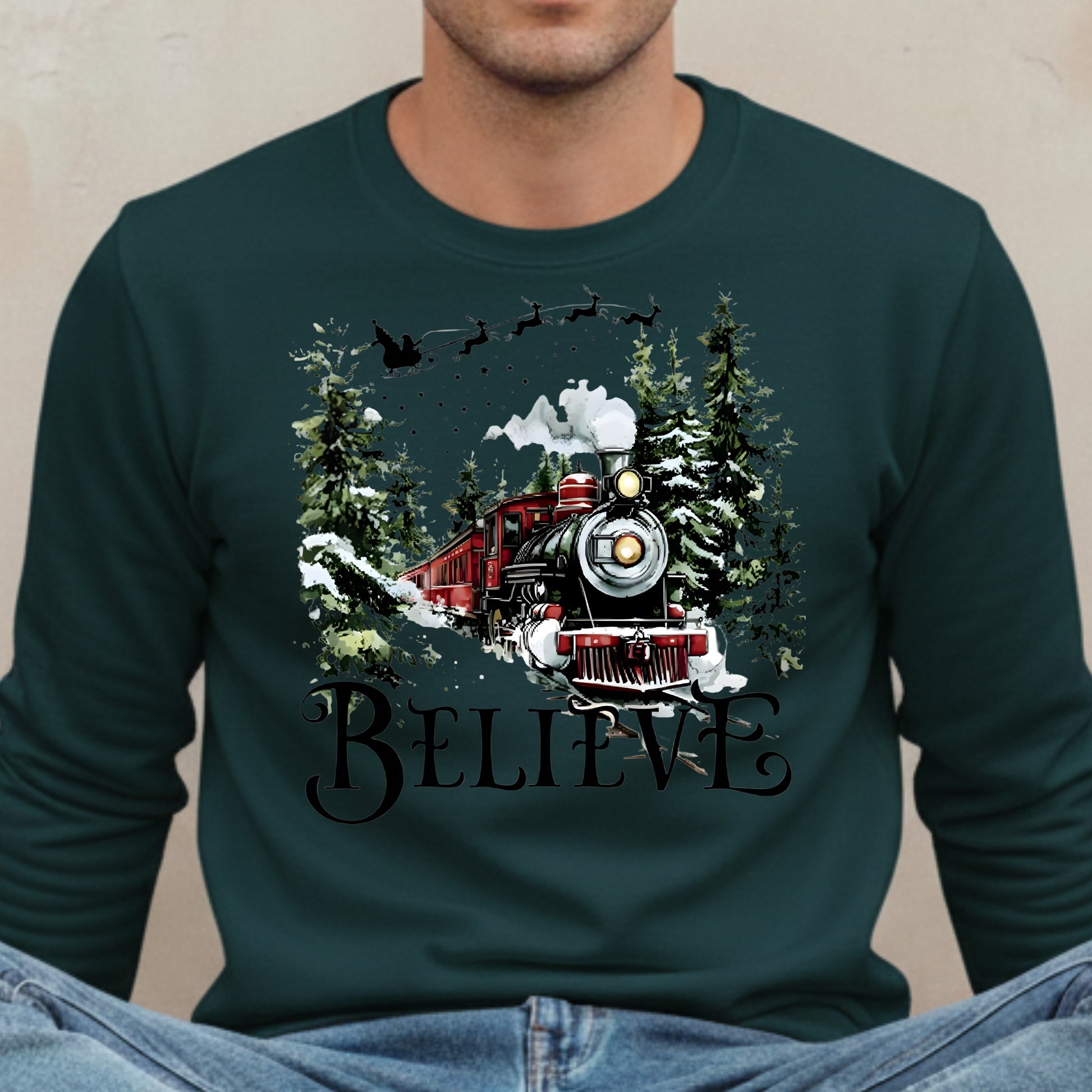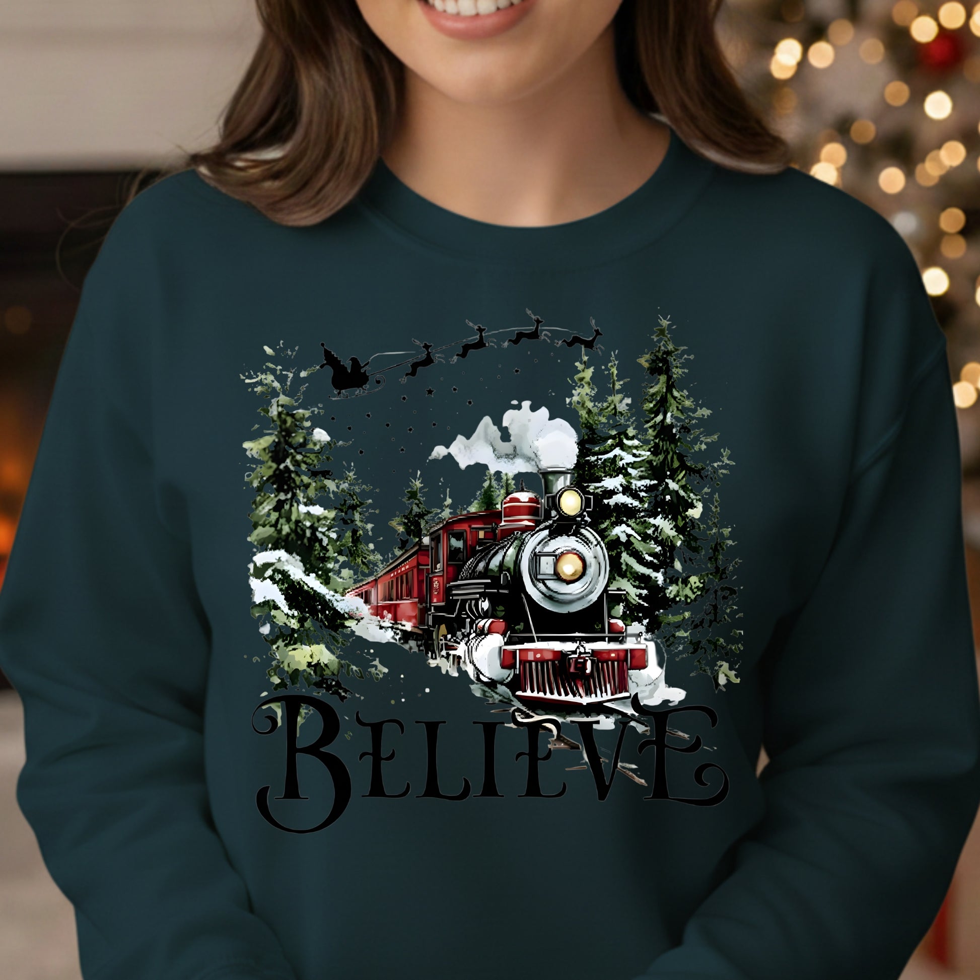 Believe Christmas Train Sweatshirt - Vintage Santa Sleigh Holiday Crewneck Pullover